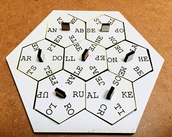 In this lasercut wooden game, players compete to make words on a dynamic, everchanging hexagonal board. As the game progresses, the letters shift to allow discovery of newly formed hidden words.