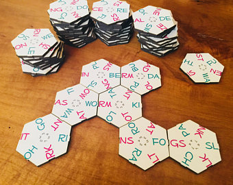 Hex-A-Spell is a four-letter word game using fragmented letters on hexagonal tiles. Hex-a-Spell has six fragments (bigrams) per tile to allow you to make four-letter words. 60 lasercut, wooden tiles with three starting bigrams and three ending bigrams per tile. Each tile has been algorithmically designed using the most common bigrams in the English language.