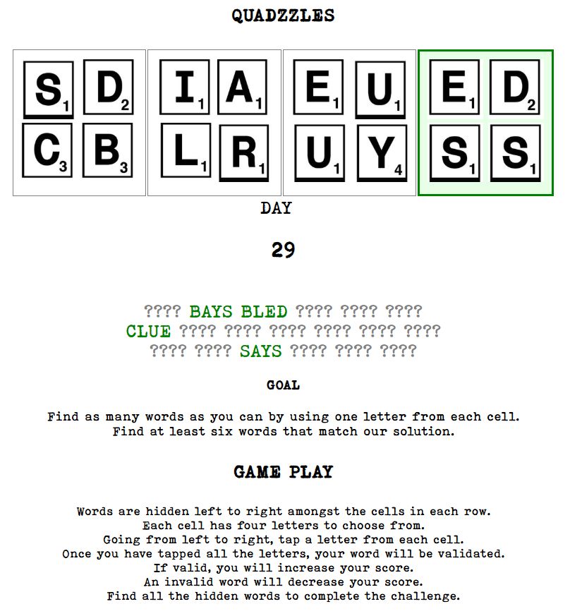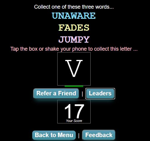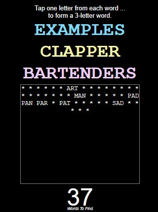 A Boggle-like word game where you try to find all the three-letter words hidden at your current location.