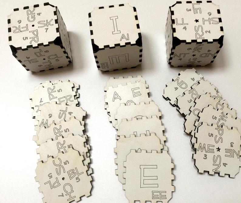Roll-A-Word uses cubes for kids to form words. Assemble the cubes from friction-fit, snap-together lasercut wooden segments.