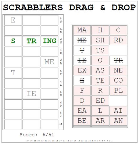 Scrabblers are unique lasercut bigram and trigram tiles to play various new word games or to enhance your existing Scrabble ©™ game. These double- and triple-letter tiles give you extra points for extra fun!