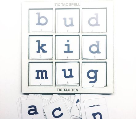 Two Games in One Box Play a fast-paced math game or a word game. Tic Tac Ten: line up numbers that sum up to 10. Tic Tac Spell: line up letters to form 3-letter words.