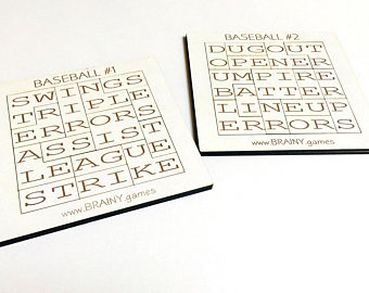 A series of brainteasers with words from specific sports. Lasercut from wood. A unique gift for a "buddy batter", a sports team or any sport lover. Each 6x6 puzzle has seven hidden words to decode, six across and one running on the left from top to bottom.
