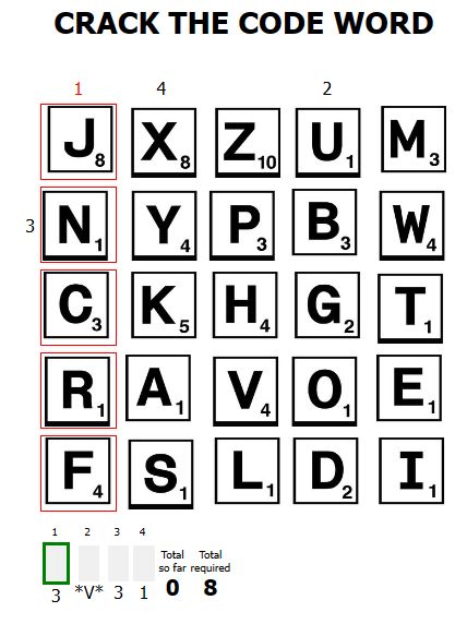 Using a combination of eight letters on four cards and four tiles, attempt to make one or two four-letter secret words.