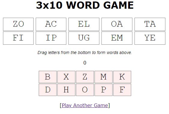 Make three-letter words by connecting single letters with two-letter bigram fragments. Fun game for all ages five and up. Stack tiles for bonus points. Connect multiple edges for extra points.