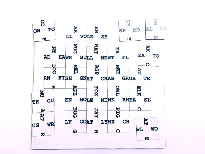 Hidden among 25 tiles in this brainteaser are 50 animal names. 25 3-letter animals and 25 4-letter animals on magnetic tiles.