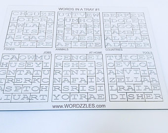 Each set of brainteasers comprises seven word puzzles, also called word squares. Move the myriad tetris-shaped pieces in various ways to form words. Each puzzle will reveal six 3-letter words downwards and across.