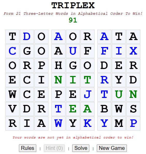 Wordzzles are solitaire word game brainteasers like "Word Squares". You are provided with unlimited challenges and you get to access new ones forever. Pick a challenge and rearrange its nine random letters into six 3-letter words: three words across and three words down.